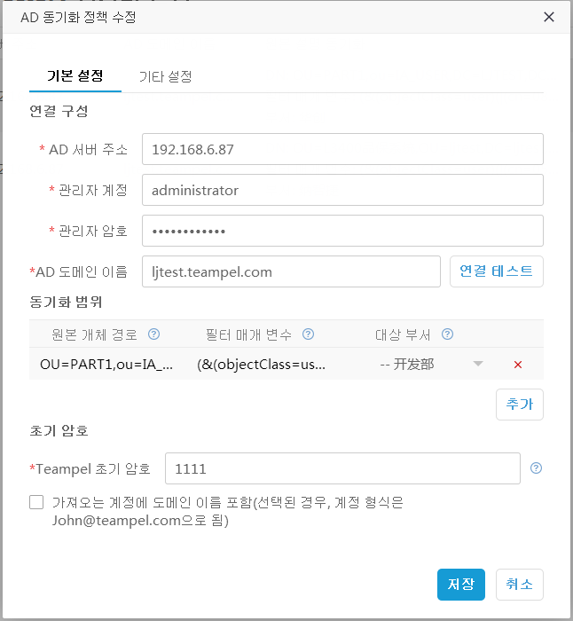- 엔터프라이즈에 여려 개의 AD 서버가 있는 경우, 여러 동기화 정책을 작성하여 여러 AD 서버의 사용자(User) 또는 조직 부서(OU)를 Teampel 시스템으로 가져올 수 있습니다.