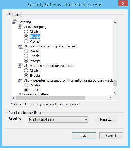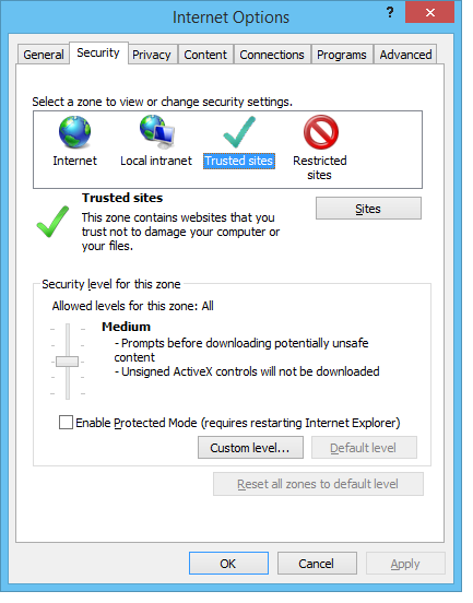 - [Security] > [Trusted sites] > [Custom level]를 선택하여 보안 수준을 사용자 지정합니다.