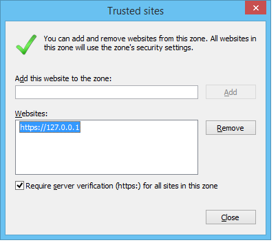 - [Internet Options] 대화 상자에서 [Security] > [Sites]를 선택하여 [신뢰할 수 있는 사이트] 대화 상자를 표시합니다.