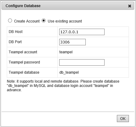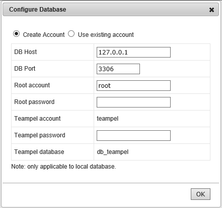 - 구성 마법사는 Root 계정으로 데이터베이스에 액세스한 후, Teampel 계정을 만듭니다. Teampel 계정이 성공적으로 작성되면 Root 계정으로 데이터베이스에 액세스한 연결이 자동으로 끊어집니다.